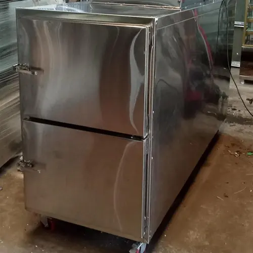 Two-body stainless steel mortuary cabinet with trolley system. Operates at +4°C, uses R134a refrigerant, and requires 220V power. Features copper evaporator and glass wool insulation.