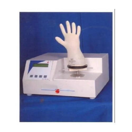 MS glove integrity tester with 230 V AC, 50 Hz operation. Adjustable pressure up to 99.9 kp and leak time from 1-999 seconds. Dimensions: 36x38x20 inches.