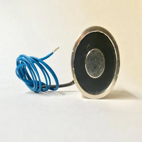 MS round DC electromagnetic coil, Model KEM-50. 50mm outer diameter, operates on DC 12/24V with 1A current. Lifts 70 Kg.