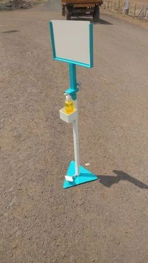 Sanitizer stand constructed from MS pipe and sheet, approximately 7 Kg weight. Designed for stable placement and easy dispensing. Suitable for various locations.