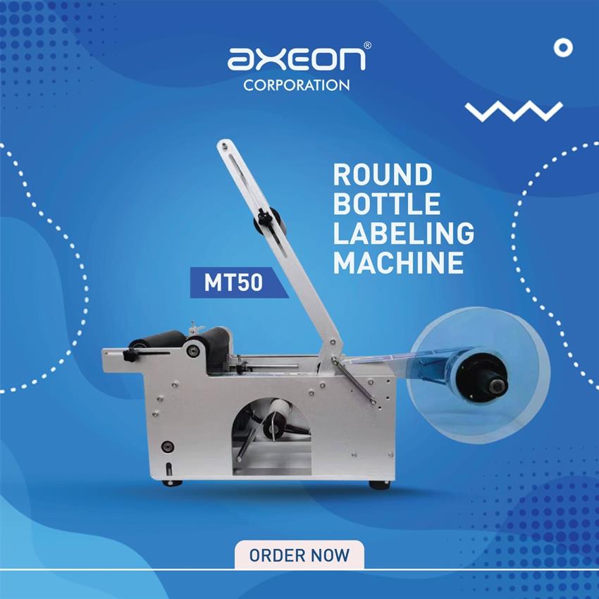 Semi-automatic MT 50 labeling machine for round bottles. Operates at 10-40 PCS/MIN with 0.5mm accuracy, suitable for various label sizes.