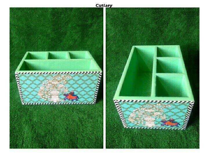 Rectangular wooden cutlery holder with a blue Mughal print. Features a Meena finish. Ideal for home use. Minimum order quantity of 50 pieces.
