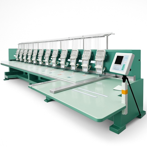 Multi-head automatic sequin embroidery machine. Features 15 needles, 1200 RPM speed, 200m/hour capacity, 2kW power, 220V single phase. Uses machine stitching onto fabric.