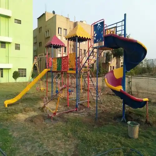 MS and FRP outdoor nursery slide equipment for ages 3-12. Features 2 platforms, 1 breeze, 1 cercular swing, 1 double swing, and 2 seater sea-saw.