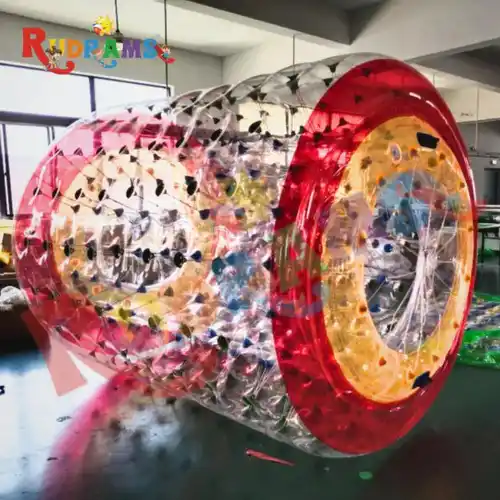 Multicolor TPU Water Roller, 9x11 ft, accommodates 6-7 persons. Features a cylindrical design, ropes, and includes a blower and repair kit.