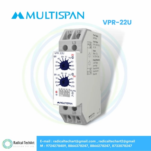 Multispan VPR-22U voltage protection relay for control panels. Operates at 280V AC, 5A, 50Hz. Suitable for ambient temperatures up to 55°C and 95% RH.