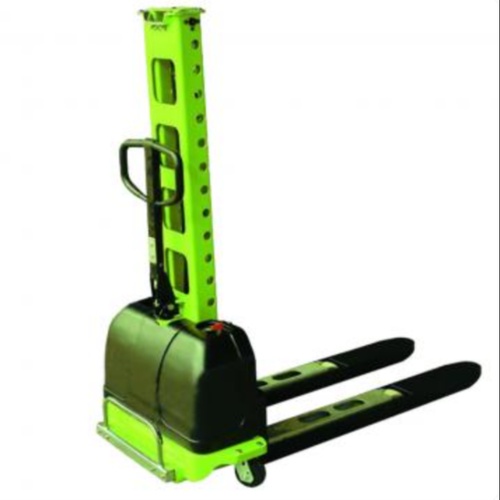 Battery-operated fork stacker for material handling. Mild steel construction with 500kg lifting capacity. Includes 12 months warranty. Self-loading functionality.