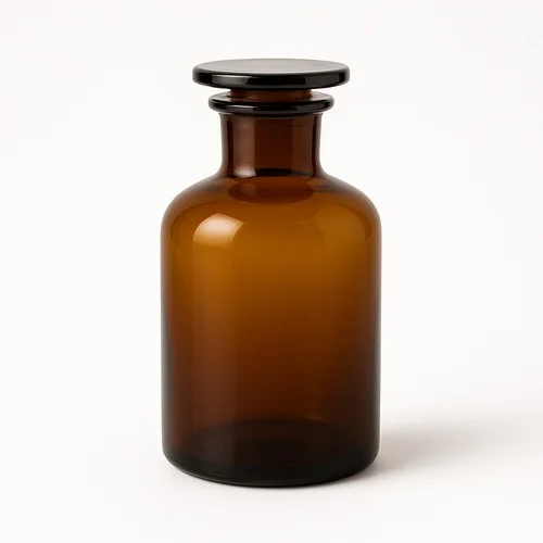 Amber glass reagent bottle with a narrow mouth. Features a glass cap for secure sealing. Reusable, 500 ml capacity. Made in India.