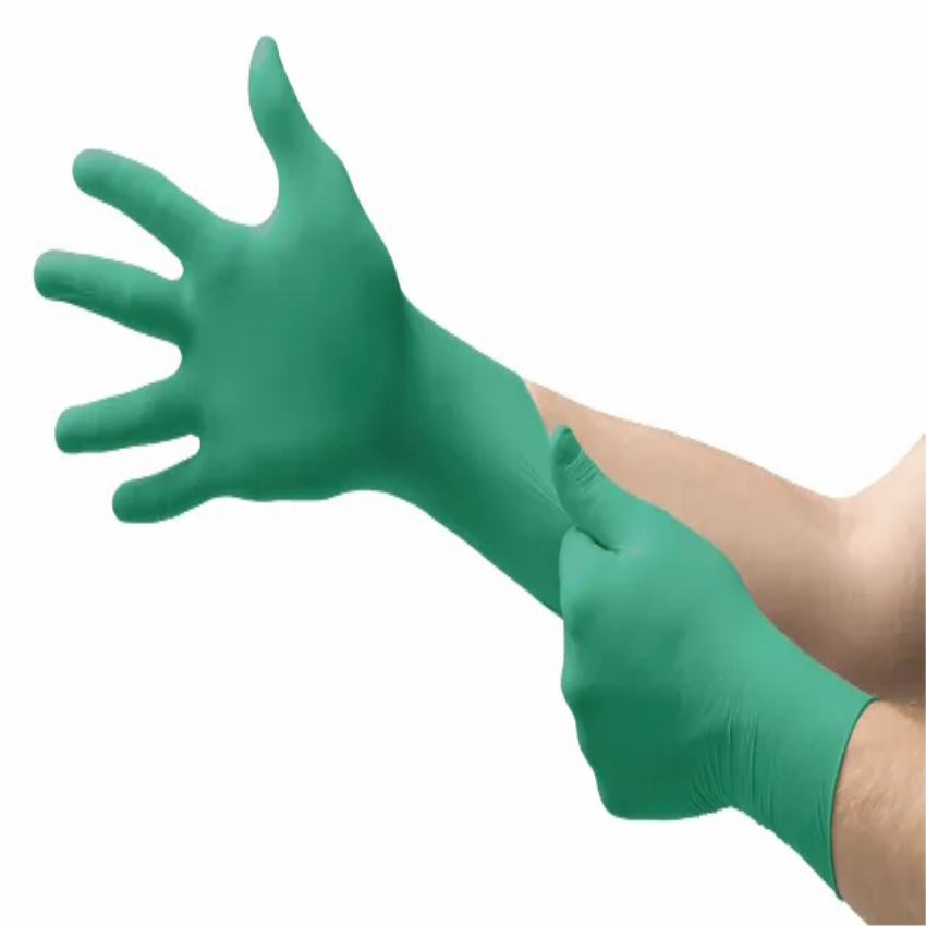 Powder-free nitrile examination gloves, green, 50 pairs per box. Compliant with EN 374, offering chemical splash protection.