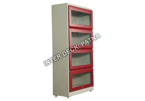This office display cabinet is 6 feet high, constructed from steel, and features 4 shelves. It has a paint-coated finish for durability and is suitable for office use.