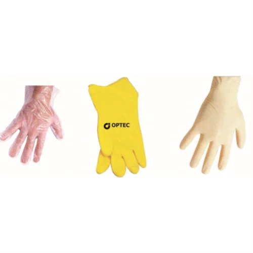 Unisex blue and white gloves, Optec model. Made from nitrile and latex. Disposable, suitable for all purposes. Available in S, M, L sizes.