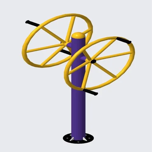 Outdoor gym double wheel builder with GI pipe material and powder coating. Dimensions: 1520mm x 760mm x 1675mm. Base plate 250mm.