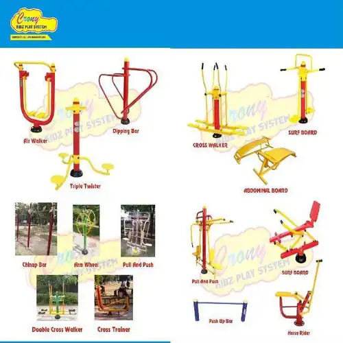 Outdoor gym equipment set featuring 15 machines. Designed for public fitness spaces and parks. Durable construction for outdoor use.