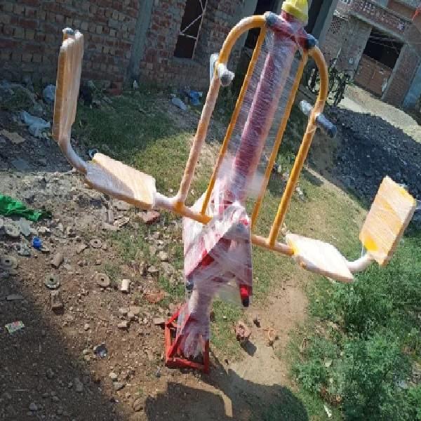 Gym leg press machine with iron seat, red and yellow color. Features a 120 kg weight stack and manual operation.