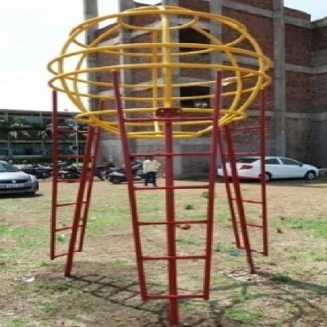 Durable mild steel moon climber machine for ages 6-12 years. Features 14 gauge CR pipe (32, 25, 50 mm) with Nippon paint coating. Requires 5x5 ft safety play area. Height is 12 ft.