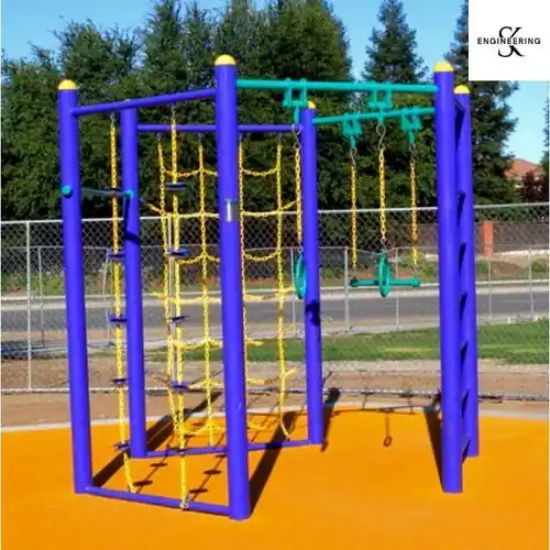 High-quality CR pipe (ISI Mark) outdoor jungle gym equipment. Features Nippon paint coating. Suitable for ages 6-12 years. Requires a 2x10ft safety play area. Pipe diameter: 60mm.