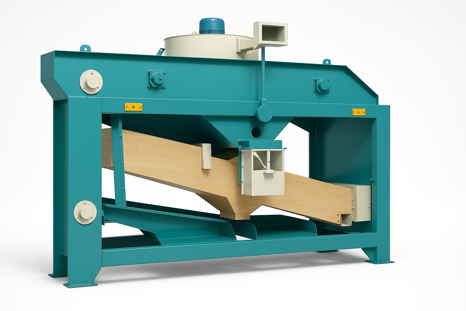 Triple deck painted grain cleaning machine with 12 TPH capacity. Features automatic operation, three-phase power, 5 HP motor, and MS contact material. Utilizes 2 Kwh power at 415V.