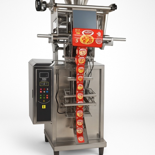 Automatic grade SS machine, 240V, single phase. Pneumatic power source with 2 HP. Offers three-side seal and 45 pouch/minute capacity.