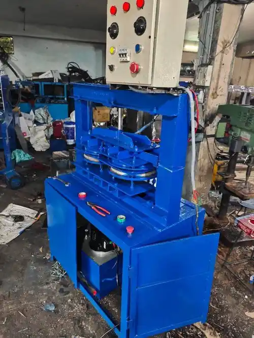 Semi-automatic Double Die Paper Plate Making Machine. Produces 1500 plates per hour with an 11-inch plate size.