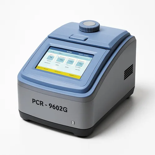 This PCR Gradient Thermal Machine (PCR-9602G) has a 48-well sample capacity and a 0.1 mL thermal block volume. It is a white and blue machine, Made in India.