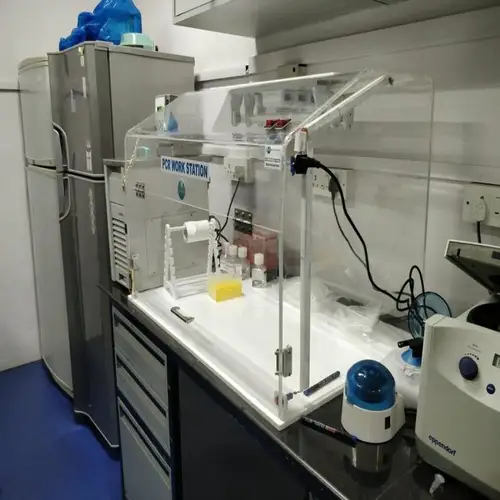 BSE model PCR workstation featuring a HEPA filter for contamination control. Equipped with UV and white light sources. Available in acrylic or metal body with customized sizes.