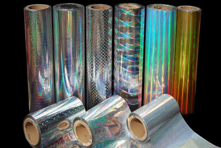 Silver PET film with holographic print for lamination and printing. Treated both sides, 13 micron film, available in custom length roll packs.