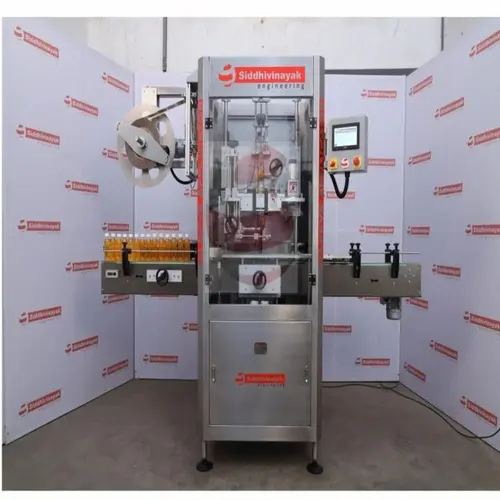 Automatic PET shrink sleeve labeling machine for sticker labeling. 420V, 50Hz, 1.5 HP. Production capacity 100 BPM, output 2400-6000 per hour.