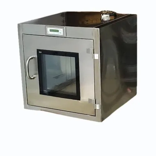 Rectangular static pass machine for pharmaceutical industry. Made of stainless steel with a powder-coated surface. Operates on 240V, 50Hz, single phase. Size: 2x2x2.