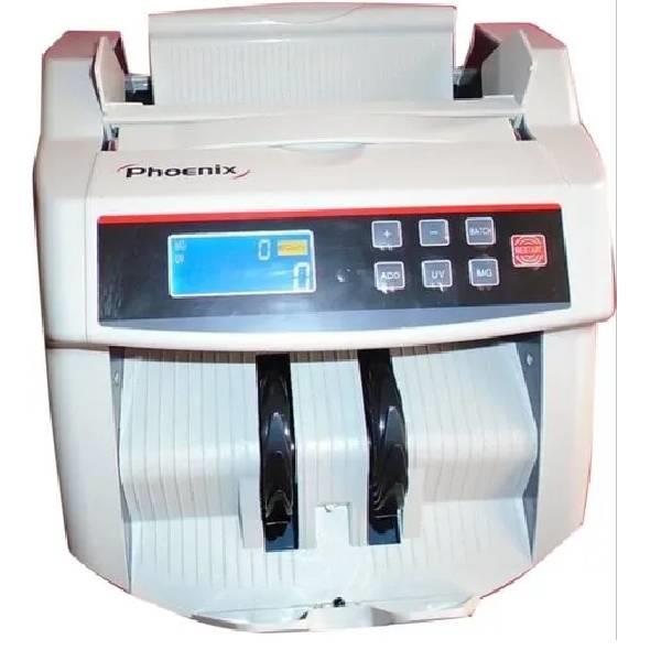 Automatic Phoenix fake note detection and counting machine. Features 500 note hopper capacity, 50 Hz frequency, and 250W power consumption. Constructed with mild steel and ABS plastic.