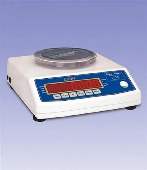 Stainless steel blood weighing machine with up to 1 kg capacity. Features a green bright vacuum fluorescent LED display and 24-bit ADC resolution. Powered by battery.
