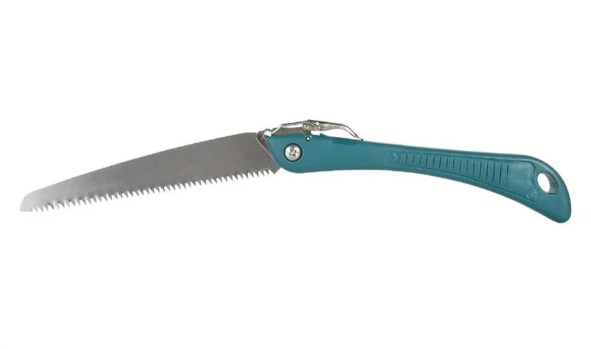 Foldable hand saw made of stainless steel with a plastic handle. 12-inch length, 150g weight. Green and silver color.