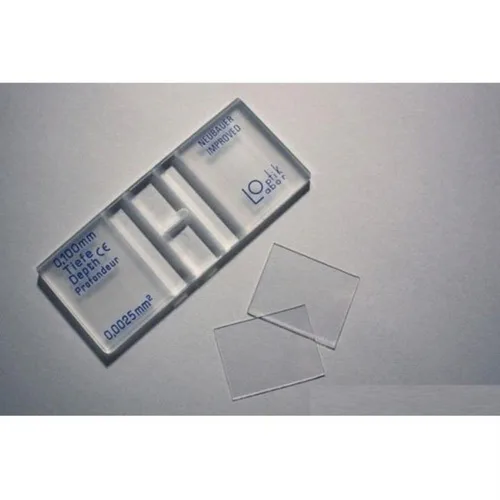 This transparent, square plastic hemocytometer is designed for laboratory use. It comes in a box pack and has a volume of 0.0025mm2 for cell counting.