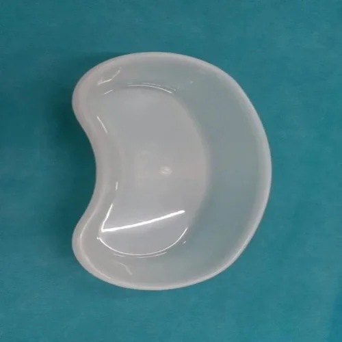 An 8-inch white plastic kidney tray, manufactured in India for hospital applications. This durable instrument is lightweight and cost-effective for single or multiple uses.
