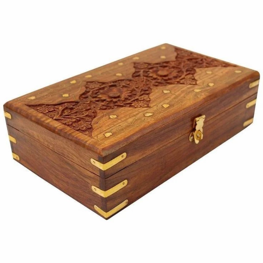 Handmade, polished pine wood gift box with a round shape. Brown color, non-waterproof. Perfect for storing small items. Made in India.