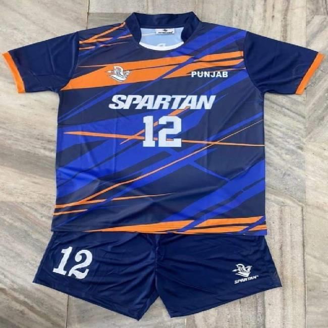 Men's polyester sports uniform with a round neck. Designed for sportswear occasions. Features machine washable fabric for easy care. Available in various sizes.