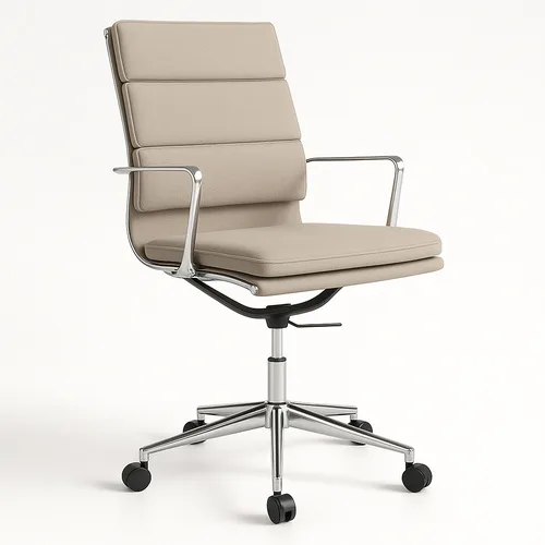 This rotatable office chair features fixed arms, five stainless steel legs, and a plain patterned polyester seat. Non-foldable design for durable use.