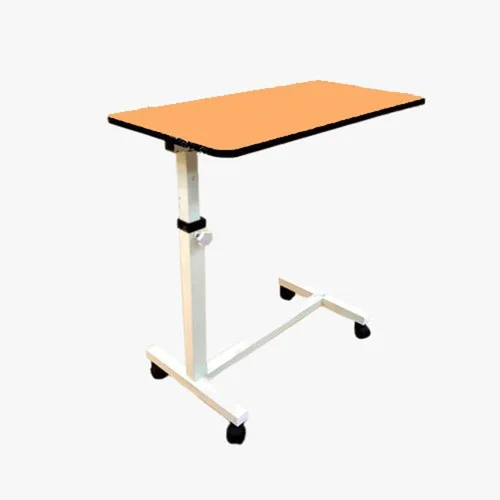 Portable overbed table with 32" x 16" overall dimensions. Constructed from mild steel with 4 wheels for easy mobility. Made in India.