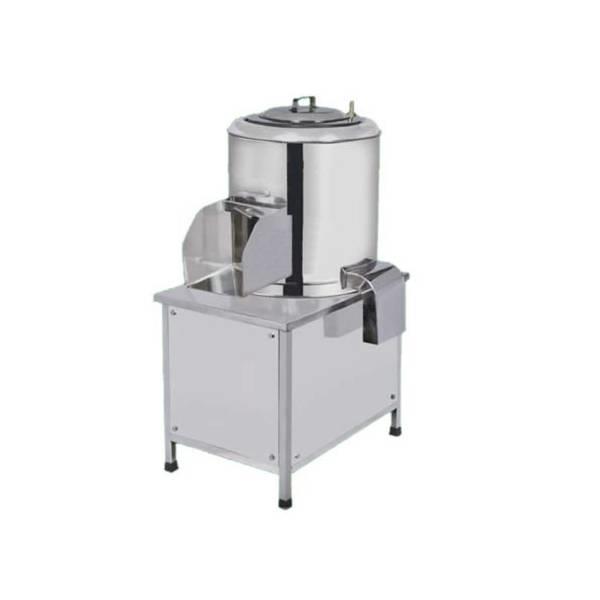 Semi-automatic potato chip production equipment. Features stainless steel components. Operates on a 220/230 V voltage range for efficient snack manufacturing.