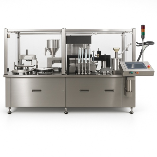 Stainless steel semi-automatic electric driven filling machine with 1.5 kW power consumption. Designed for precise filling operations in pharmaceutical applications.