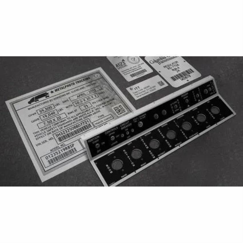 Waterproof, rectangular printed aluminium label with adhesive backing. Thickness ranges from 2 to 3 mm. Ideal for durable labeling applications.