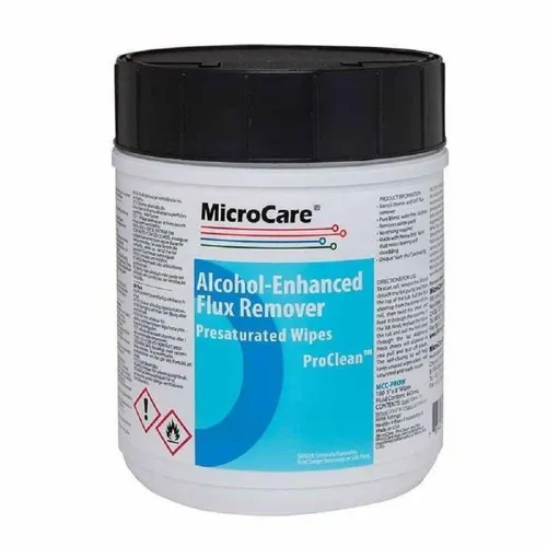 Alcohol-enhanced flux remover wipes for laboratory use. Presaturated in a HDPE container. Model MCC-PROW. Backed by a 6-month warranty.