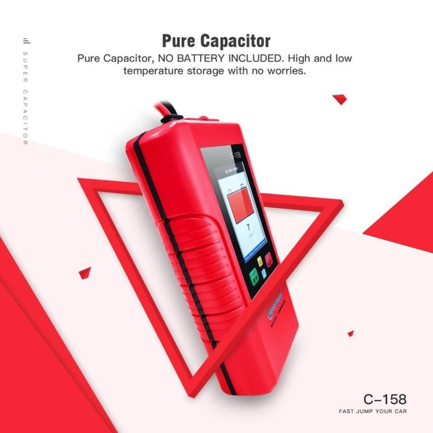 Red PVC 12V jump starter and battery booster. Made in India, packaged in a box. Essential for vehicle battery emergencies.