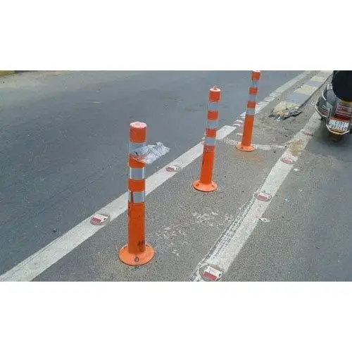 PVC plastic road safety spring post, 750 mm height, in orange and white. Features 3 reflective bands for increased visibility.