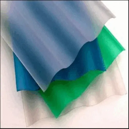 P.V.C. roofing sheet, Greca profile, 0.9 mm to 2.0 mm thickness. Available in opaque and translucent colors for various construction applications.
