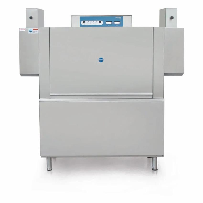Fully-automatic freestanding rack conveyor dishwasher for commercial use. Features prewash, wash, rinse, and drying zones. Voltage: 410V/3 Phase.