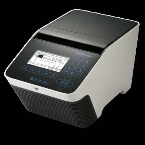 Commercial grade Real Time PCR machine in black and grey. Color coated finish. Packaged in corrugated box. Made in India for professional laboratory use.