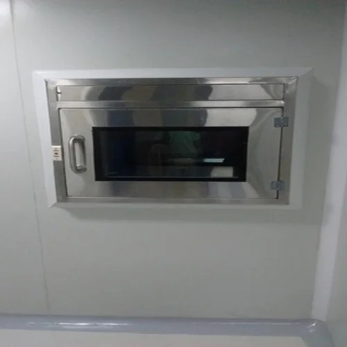 Rectangular SS pass box for hospital use. Size: 770 X 680 X 1200 mm. Operates on 240 V single phase electric power. Achieves an air velocity of 0.4 m/s.