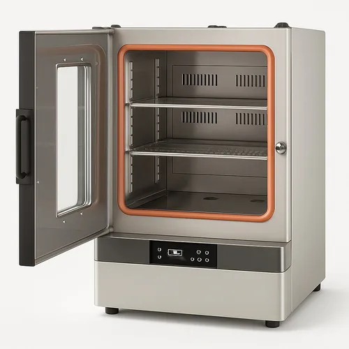 Automatic stainless steel drying oven, 100-500 Kg capacity, rectangular shape. Features horizontal airflow, digital display, and a max temperature of 400°C. Operates on 50 Hz frequency.