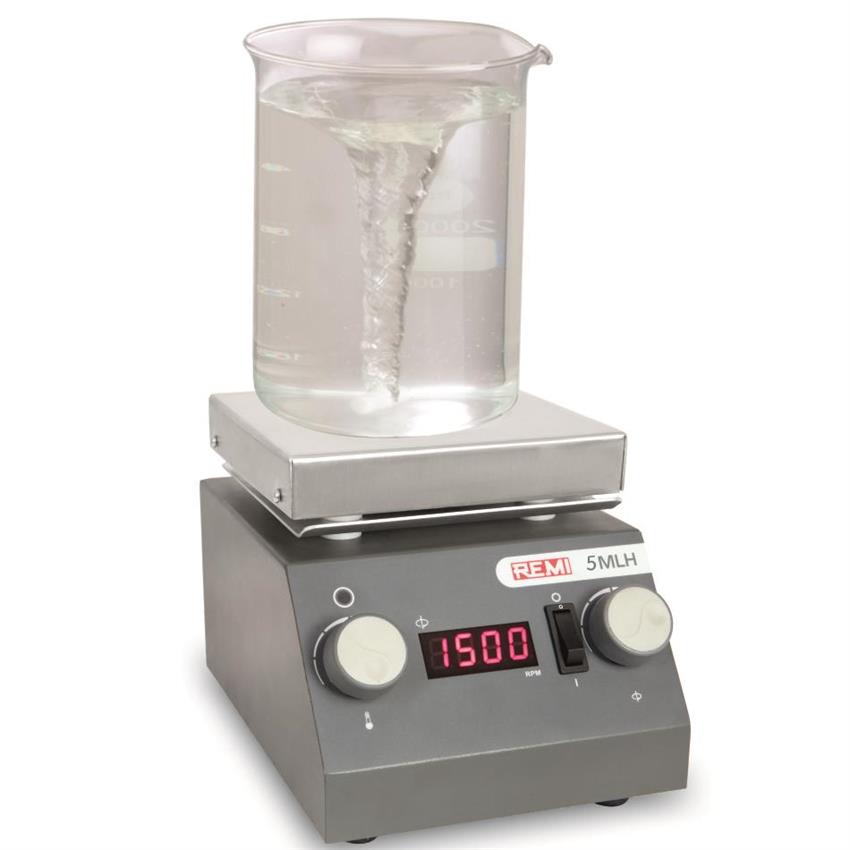 Remi magnetic stirrer, 5 mlh model, s.s. material. Features 2000 RPM speed range and 150°C surface temperature. Operates within 5°C ambient temperature.