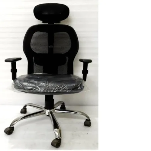 Ergonomic high back chair with tilting backrest and revolving base for enhanced comfort and mobility. Durable black material with a smooth, functional design.